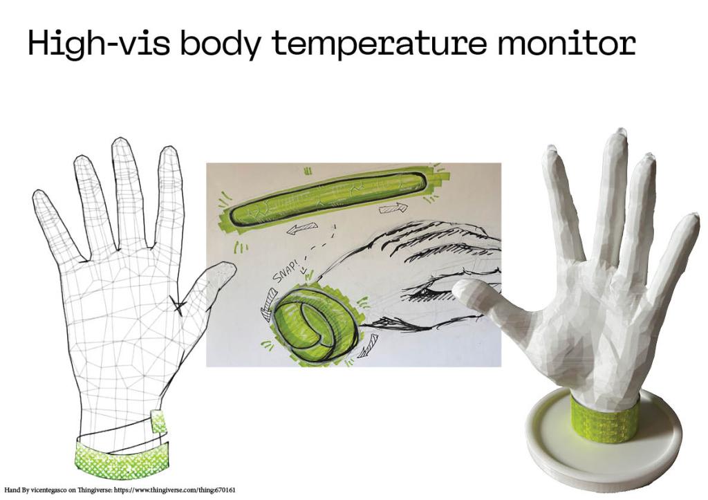I 3D printed a hand to add context to the prototype, which I believe also made the prototype look more impressive. In hindsight, I should have never admitted to it being a wristband like in the drawing, and should have just pretended it was gel – but at this point I did not yet understand that there is still value in presenting a prototype to submission.