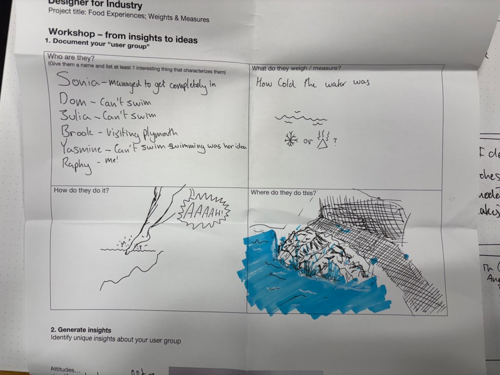 We were told to take photos of people measuring things and use this as research for our product. An idea came to me later on when seeing my friends screaming at the cold water when we went swimming together.