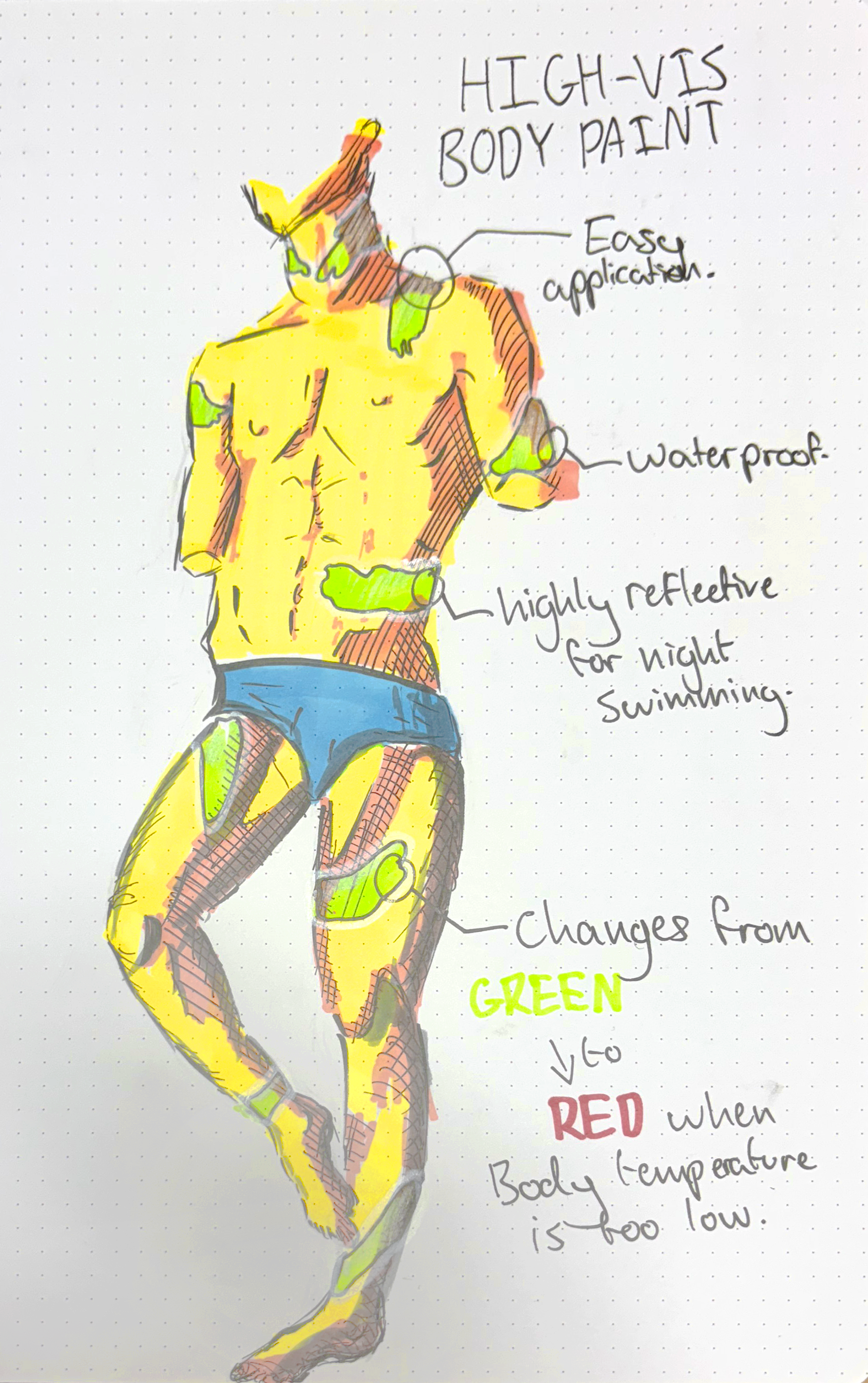 If the temperature got to low, the gel would turn red, allowing people at shore to know whether the swimmer is in danger or not.