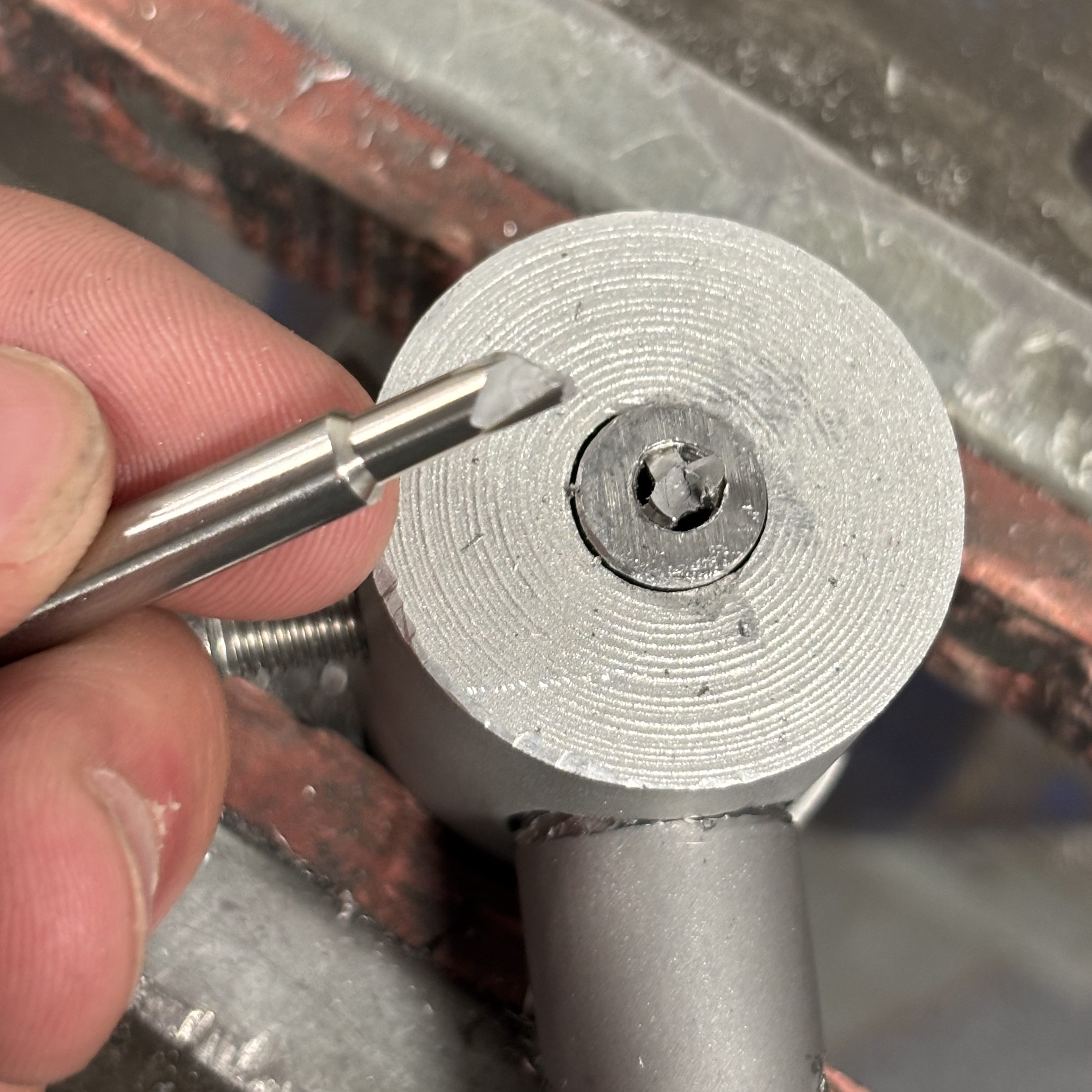 Knowing this, one might have thought twice about threading it with a regular steel tap, but not me apparently. The tap snapped off while lodged deep inside the silver steel, with 0 chance of recovery.