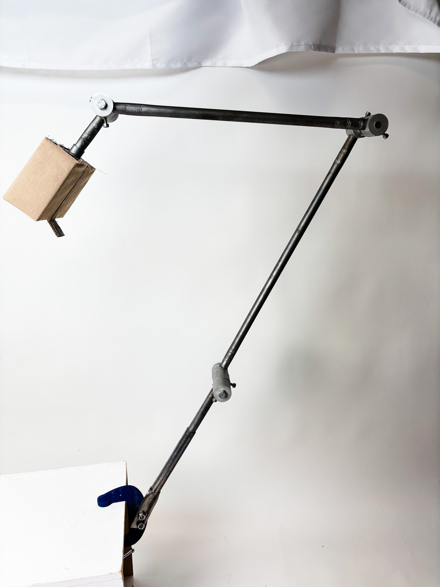 My secondary issue is that at time of writing, the lamp is mostly constructed, but I have no base to attach it to. I want the lamp to be able to rotate, but the lamp is too heavy for anything except the heaviest of bases, given how far it can reach. This is why the most practical solution for a base is a clamp, that would attach to a table or desk (or in a more industrial context, a ceiling beam or an I-beam pillar.)